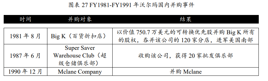 外延并购:大举并购同行业的公司。如:1981年8月上演的一场“蛇吞象”并购事件,沃尔玛并购美国南部的一家折扣连锁百货店BigK,获得该公司总共120家分店,门店数从FY1981的330到FY1982的491。此后沃尔玛长期通过内生展店和外延并购的方式扩张。