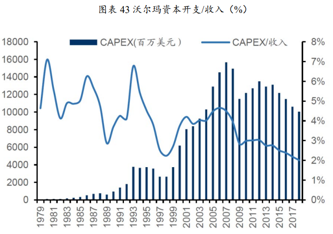 1)山姆沃尔顿坚持扩张的理念。成立于1869年的美国零售企业A&P在二战以前依靠连锁模式在当时独占行业鳌头,但到1965年后大量分红且不愿负债扩张,资本开支不足导致其失去龙头地位逐渐被时代抛弃。而沃尔玛从成立之初便坚定推行通过快速展店占领市场提升规模以抗衡大型公司的策略,盈利后立刻投资扩张。