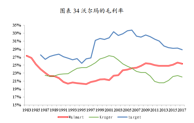对于沃尔玛来说“天天低价”并不仅是口号,而是坚定执行的发展政策,20世纪80年代初沃尔玛27%的加价倍率是折扣百货中最低的,1985年降至25%,80年代末进一步降低至23%。由于产品实行“低价格”策略,与竞争对手相比,沃尔玛并不具备毛利率优势,在国际化扩张前持续降低并显著低于竞争对手。