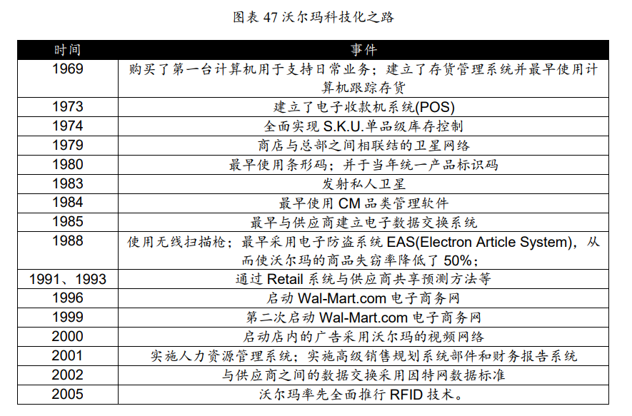 信息系统助力公司直采,通过集采实现规模经济优势,进一步降低成本:1962年开出第一批折扣店后便刊登促销广告宣称“全国性商品最多可打折50%”,其中虽有夸大含糊的成分,但部分商品大幅折扣的基础是沃尔玛多数商品直接从制造商处进货以降低采购成本,允许同样的商品价格至少比竞争对手低20%。20世纪80年代初,沃尔玛采购成本的2%--6%为经销商所要收取的利润,想降低采购价格,必须消减零售终端与商品制造企业中间的环节,当时沃尔玛曾试图从交易中剔除制造商的销售代理直接拿货,但由于制造商和经销商之间利益分配已非常成熟,以及在商品产出发生波动时通过经销商可以更好地掌握市场价格,制造商不愿开通直采通道。此后在80年代末,日化巨头宝洁开始与沃尔玛直接合作。宝洁愿意与沃尔玛合作的最基础原因在于沃尔玛已经在全国布局超过1300家门店,逐渐赶超西尔斯成为全国最大的终端零售渠道。此外,更重要的原因是以卫星通信和“电子数据交换系统”为基础的“持续补货系统”使两家公司深度合作成为可能。通过不断完善现代化的供应链管理体系及信息系统,沃尔玛克服了规模不经济,建立强大的分销网络,从而帮助沃尔玛具备了极强的议价能力,在采购方面建立了很强的成本优势。