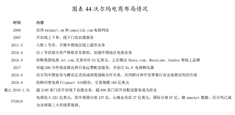 随着互联网技术的发展,在亚马逊等电商平台的竞争下,沃尔玛与时俱进、不断变革,电商业务全速前进。早在1996年即上线了网上商城,但用户体验与反馈不理想。2000年正式确定发展电商的长期策略。2015年后沃尔玛充分利用其密集的线下渠道资源与优质的供应链能力,探索线上线下整合的道路,包括线上下单与线下自提、仓配自动化、店内机器人、店仓一体化、通过收购合作补强电商资源、重视中国等新兴市场电商发展。