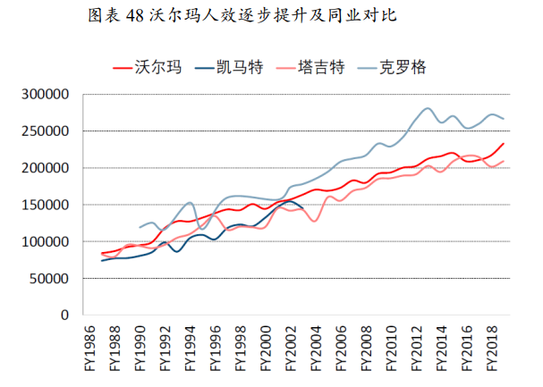 沃尔玛成功的因素有很多,其中有一点就是公司员工与管理者之间的良好合作关系,即“合伙人”制度。沃尔玛的合伙人制度一共包括4项计划:利润分享计划、员工购股计划、损耗奖励计划和福利计划,通过一系列激励措施以充分调动员工的积极性和执行力。公司人效从FY1986的8.45万美元增至FY2019的23.38万美元,CAGR为3.2%。与同业对比,沃尔玛人效处于行业中上水平,优于塔吉特与凯马特。