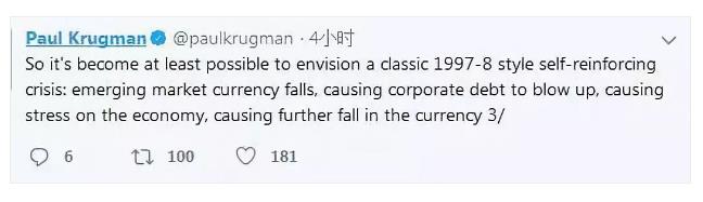世界将会怎样?有趣的是,克鲁格曼在今年5月23日表示,新兴市场危机警报已经拉响,“看起来确实很像1997-98年那一次,新兴市场货币暴跌,企业债泡沫被无情捅破,对实体经济造成严重压力,然后本币进一步贬值”。此可待验证。