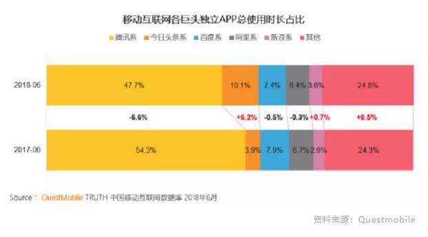根据Questmobile对中国移动互联网的研究,超过57%的互联网用户注意力,均集中于腾讯与头条。并且2017年同期的数据,几乎与2018年持平。超级巨头垄断流量入口的同时,巨头内部的集中化结构,呈现出了显著的变化。相较于2017年,腾讯的独立APP使用市场占比跌落了6.6%,而头条则增长了6.2%。