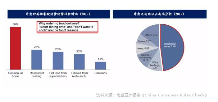 另一方面,从外卖送达地的占比来看,超过48%的外卖都送往了“家庭住址”,而非人们想象中占比可能更高的“办公室”、“学校”等工作场所。这说明对“家庭消费”的直接替代,仍然是外卖开辟出的餐饮增量消费。