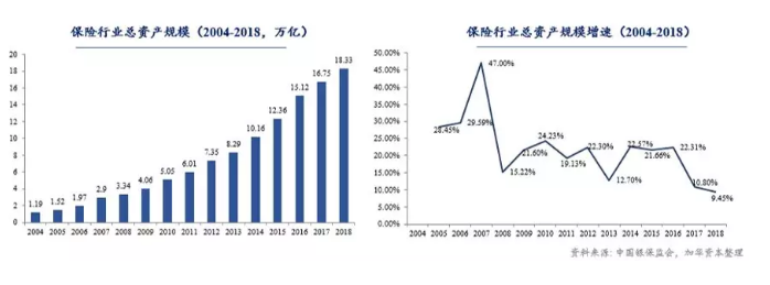 截至2018年底,全国保费收入规模约4.6万亿元,增速9.97%;我国保险行业总资产规模达到18.33万亿元,增速仍保持在9.45%。