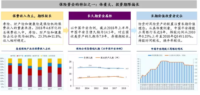2018年中国保费收入总规模约4.6万亿元,保险行业总资产规模达到18.33万亿元,其中占比较高的寿险、健康险等保险产品的存续期较长,保费收入相对稳定,而保险资金的久期一般超过10年,这一特性决定了其长期价值投资者的定位。
