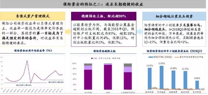 保险公司投资收益率是保单定价参数的一部分,保险投资采取基础负债管理模式,第一目标是为了满足预定利率的条件,实现投资收益率对保单预定利率的覆盖。因此,保险机构天然追求长期持续且稳健的收益。以股票配资为例,险资稳健持仓主板,配比超过90%,而在中小创股票的配置上,多以细分行业的龙头投资为主,稳健利益收割者的形象跃然纸上。
