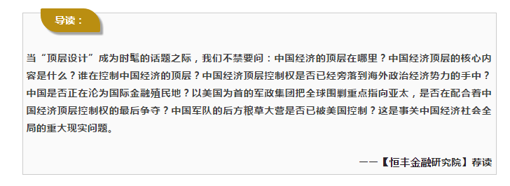 经历了四十多年改革开放,中国已经走入由美国及其美元主导的世界经济秩序的深水区。美国已经开始实施针对中国的“屠龙战略”(详见美国威廉。恩道尔的《目标中国:华盛顿的“屠龙”战略》一书)。这里到处是冰山、暗礁与漩涡。中国的经济巨轮是否可能在未来不断变幻的不测风云中触礁、搁浅和沉没,甚至像前苏联一样突然解体?当“顶层设计”成为时髦的话题之际,我们不禁要问:中国经济的顶层在哪里?中国经济顶层的核心内容是什么?谁在控制中国经济的顶层?中国经济顶层控制权是否已经旁落到海外政治经济势力的手中?中国是否正在沦为国际金融殖民地?以美国为首的军政集团把全球围剿重点指向亚太,是否在配合着中国经济顶层控制权的最后争夺?中国军队的后方粮草大营是否已被美国控制?这是事关中国经济社会全局的重大现实问题。